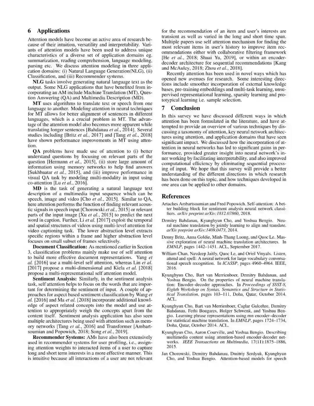 本篇综述提供了关于注意力模型的全面概述,并且提供了一种将现有注意力模型进行有效分类的分类法,我们调查了用于不同网络结构的注意力模型,并显示了注意力机制如何提高模型的可解释性,最后,我们讨论了一些受到注意力模型较大影响的应用问题。我们希望本次综述能够为为大家提供一份简明扼要的介绍,帮助大家理解这一模型并着手进行实践。