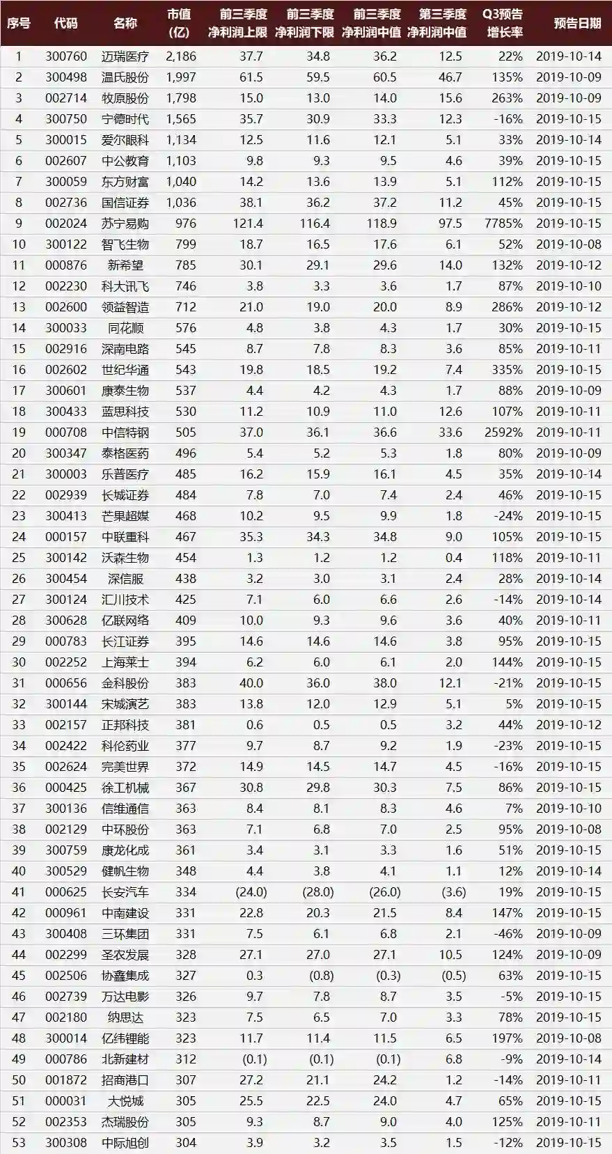 这些发布了预告的业绩怎么样呢?球球列举了市值300亿以上,在10月发布业绩预告的数据,共有53家公司: