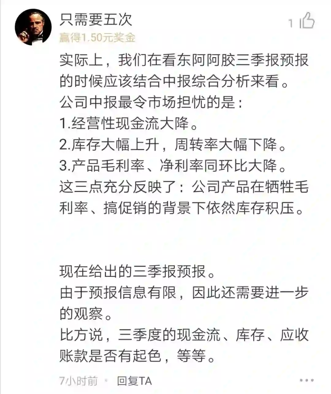 东阿阿胶在公布了一份“历史最差”的半年报后,这一份预告数据并不算好,虽然今天股价涨了。球球比较认可雪球球友@只需要五次的解读,现在东阿阿胶三季度的预告信息不足,难以判断到底是否真的走出困境了,其他如现金流,库存等核心指标需要在三季报正式发布的时候好好看看。