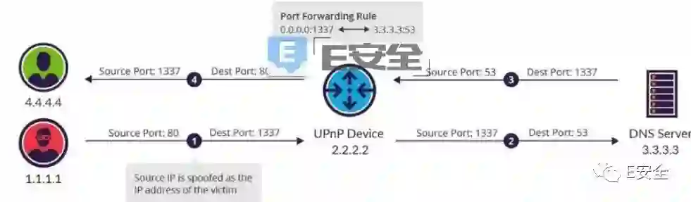 Imperva 表示已发现了至少两起采用该技术的 DDoS 攻击,并且也通过其内部 开发出的 POC 脚本成功进行了测试。该 PoC 代码通过搜索暴露其 rootDesc.xml 文件的路由器(其中包含端口映射配置),添加了隐藏源端口的自定义端口映射规则,随后发起了 DDoS 放大攻击。DDoS 放大攻击主要步骤如下:
