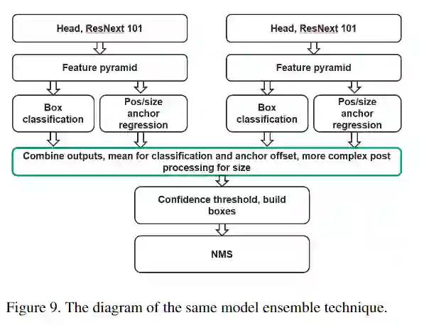 在测试时,我们通常希望最大程度地减少内存占用和推理时间。本文中提出了一个基于单个模型的解决方案,该模型集成了多个checkpoints。该模型使用了在ImageNet 上经过预训练的SE-ResNext101作为主干网络,整体网络框架使用的是 RetinaNet SSD 。
