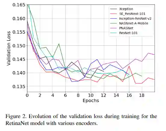 为了实现合理的快速实验和规范化,同时考虑了在精度与复杂度/参数数量和因此之间取得良好折衷的架构。图中显示了在RetinaNet SSD中使用的各种编码器训练期间的验证损失。SE-ResNext体系结构取得了该数据集的最佳性能,并且在准确性和复杂性之间取得了良好的折衷。