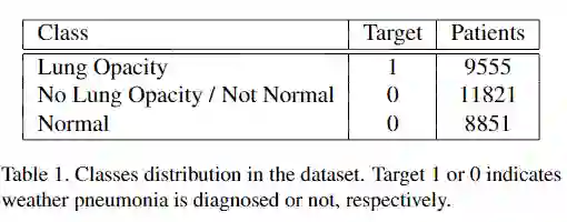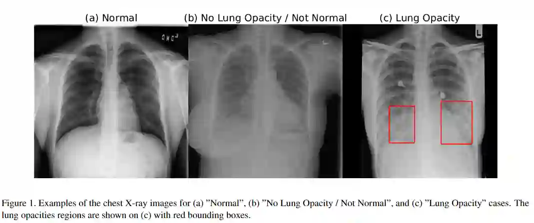 “无肺不透明/非正常”类别说明了在CXR肺不透明区域可见但未诊断出肺炎的患者的数据。图1显示了所有三个类别的CXR实例,这些类别标记有不健康患者的边界框。