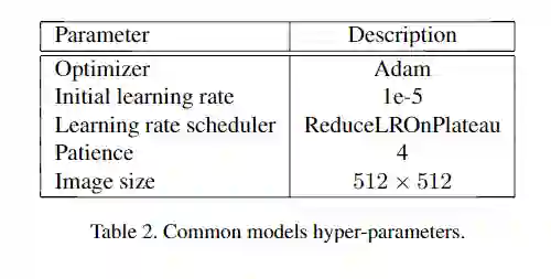原始图像按比例缩放为512×512像素分辨率,由于原始的挑战数据集不是很大,因此采用了以下图像增强来减少过拟合:轻微旋转(最多6度);移位,缩放,剪切;水平翻转;对于某些图像,模糊处理,添加噪声,进行伽玛值随机变化;有限提高亮度/伽玛增强量等。