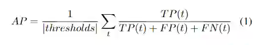 使用不同的交并比(IoU)阈值下的平均准确精度(mAP)来评估模型。阈值的范围从0.4到0.75,步长为0.05:(0.4、0.45、0.5、0.55、0.6、0.65、0.7、0.75)。