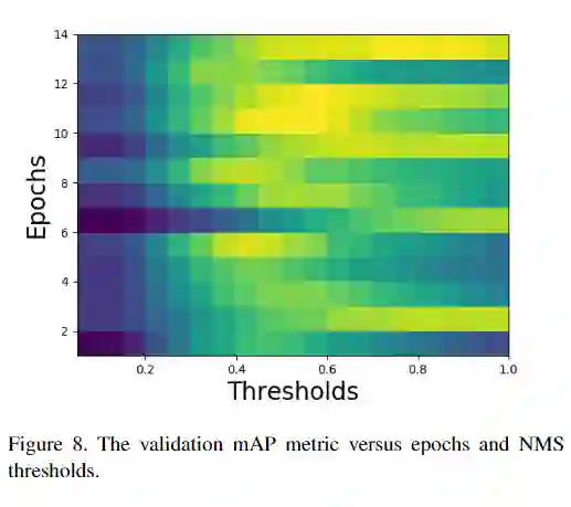 由于标记过程不同,训练和测试集的最大抑制(NMS)算法也有所不同。NMS阈值对mAP指标值产生了巨大影响。图8显示了针对不同训练时期和NMS阈值的验证mAP指标变化。验证集的最佳NMS阈值在各个时期之间存在显着差异,取决于模型,其最佳范围在0.45和1之间。