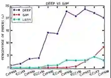 下面这张图展示了CVPR 2018的论文题目中,关键词GAN、Deep,以及LSTM的对比: