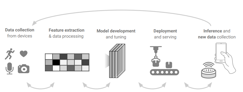 图 1.1:机器学习工作流的生命周期。处理来自个人设备的数据时遵循的迭代步骤。本论文对应用于整个生命周期的方法做出了贡献,特别关注新颖的特征提取和表示方法,以及推广到以纵向方式收集的新数据。