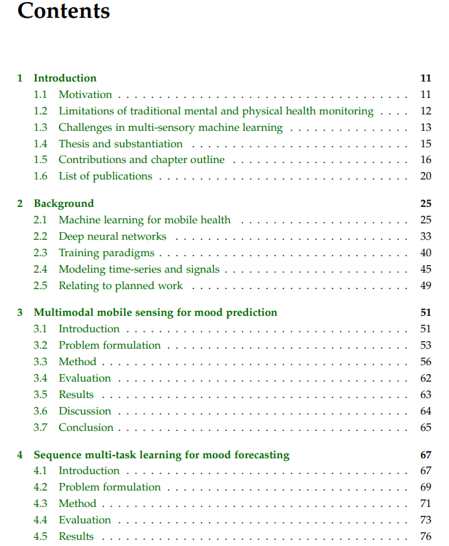 我们回顾了移动健康机器学习改进带来的一些潜在好处,采用传统方法时会出现哪些限制,以及在处理含噪的传感器数据时会遇到哪些挑战。形式上,总体目标可以表述为:改进机器学习方法,用于由消费者移动和可穿戴设备生成的动态和静态、多任务和有限监督的观察、回顾和纵向数据,用于最终目标是改善健康和福祉,重点是心理和身体健康。我们通过首先评估现有方法在大规模身心健康数据集上的潜力,然后提出优于当前方法或提供新见解的新模型来证实这一说法。我们的方法利用并扩展了多模态融合、多任务学习、时间序列预测、迁移学习和自我监督学习的范式。特别是,本论文解决了以下四个研究问题: