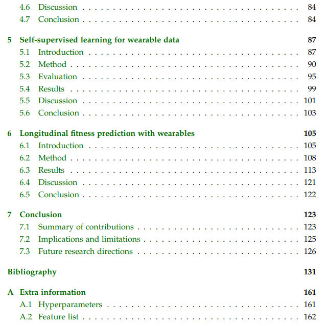 在第 5 章中,我们开发了一种新颖的自监督通用神经网络,该网络将活动数据映射到心率响应,并可用作特征提取器可穿戴数据。它的功能可用于根据用户独特生理进行个性化的各种实际下游任务,并且该模型在通过消融研究评估的上游和下游任务中优于一组强大的基线。