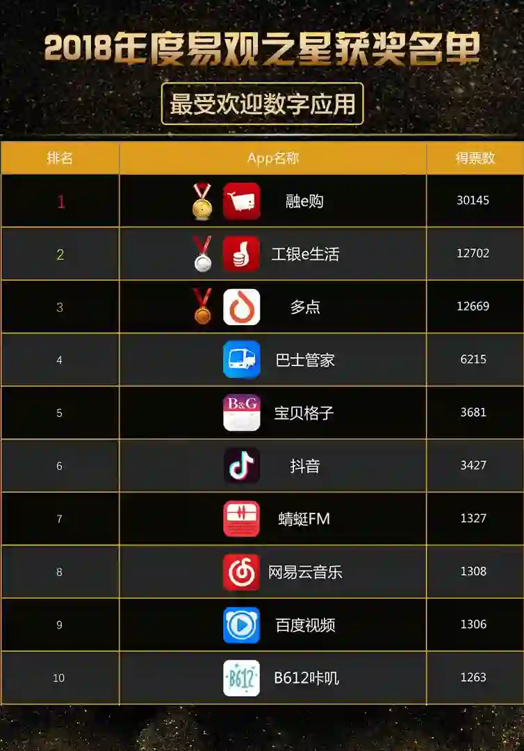 它们分别是融e购、工银e生活、多点、巴士管家、宝贝格子、抖音、蜻蜓FM、网易云音乐、百度视频、B612咔叽。详细排名结果及得票数,请参见下图: