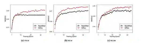 图4:GRec vs. NextItNet。可以发现NextItNet在最初epoch略优于GRec,但随着进一步优化 GRec慢慢领先于NextItNet直至最终收敛。