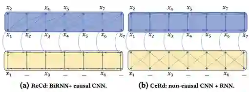 图3:GRec变种,通过替换编码器或者解码器为RNN网络。(a)的编码器为双向RNN结构,解码器为因果卷积网络;(b)与(a)刚好相反,编码器为双向CNN结构,解码器为单向RNN结构。