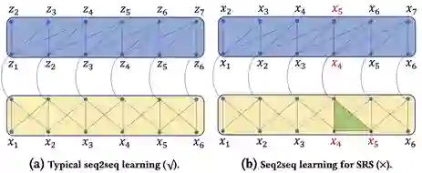 图1: 编码器-解码器结构,黄色模块为编码器,蓝色模块为解码器。(a)标准的编码器解码器结构,常见于NLP任务(例如翻译,文档摘要)和图像领域(例如图像生成标题)。由于x与z来自不同的序列不存在信息泄漏问题。(2)常规的编码器解码器结构直接用于时序推荐系统场景。可以发现解码器需要预测的物品(例如) 直接可以在编码器中看到,从而引起信息泄漏问题。