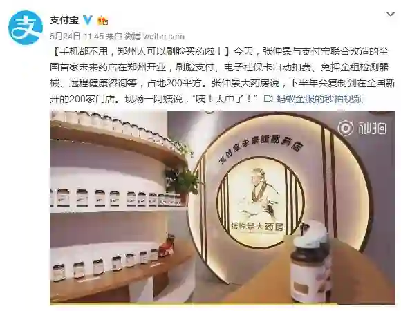 5月24日,支付宝与张仲景联合改造的全国首家未来药店在郑州开业,位于河南郑州二七区南彩路,店名就叫“支付宝未来药店”。