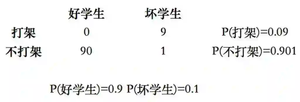 “十个坏学生有九个爱打架”就意味着“坏学生”打架的概率P(打架|坏学生)=0.9,假设根据训导处历史记录坏学生占学生总数P(坏学生)=0.1、打架发生的概率是P(打架)=0.09,那么这时如果发生打架事件,就可以通过贝叶斯公式判断出当事学生是“坏学生”的概率P(坏学生|打架)=P(打架|坏学生)×P(坏学生)÷P(打架)=1.0,即该学生100%是“坏学生”。
