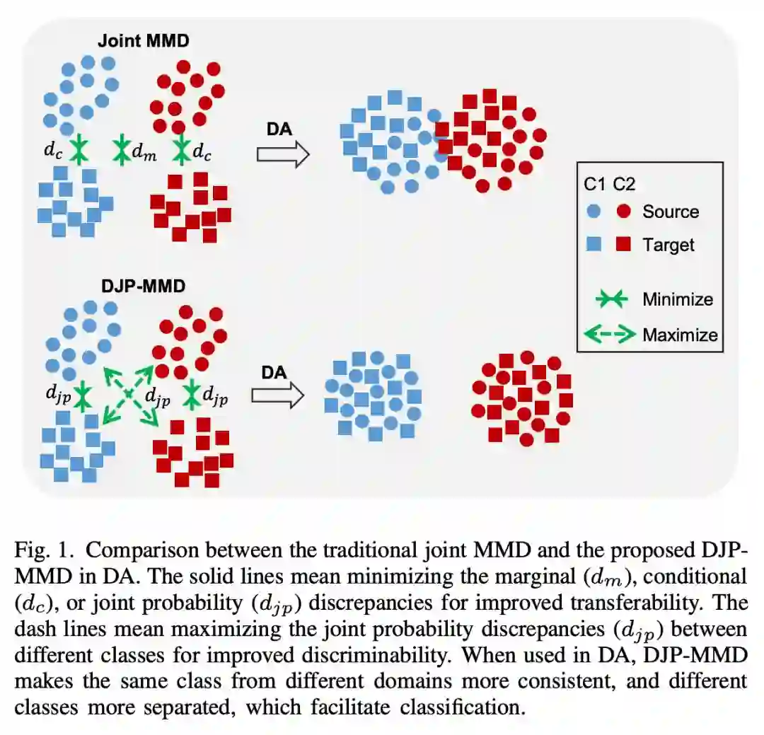 本文提出了一种简单而有效的 DJP-MMD 方法。通过最小化源域和目标域(即,提高域可转移性),最大限度地提高不同类的联合概率 MMD(即,增加类的辨别力)。