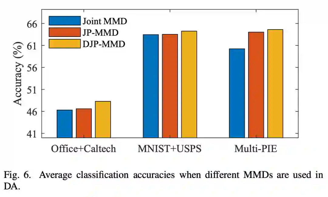 从柱形图上看,JP-MMD 优于联合 MMD,而 DJP-MMD 进一步考虑了可分辨性,获得了最好的分类性能。