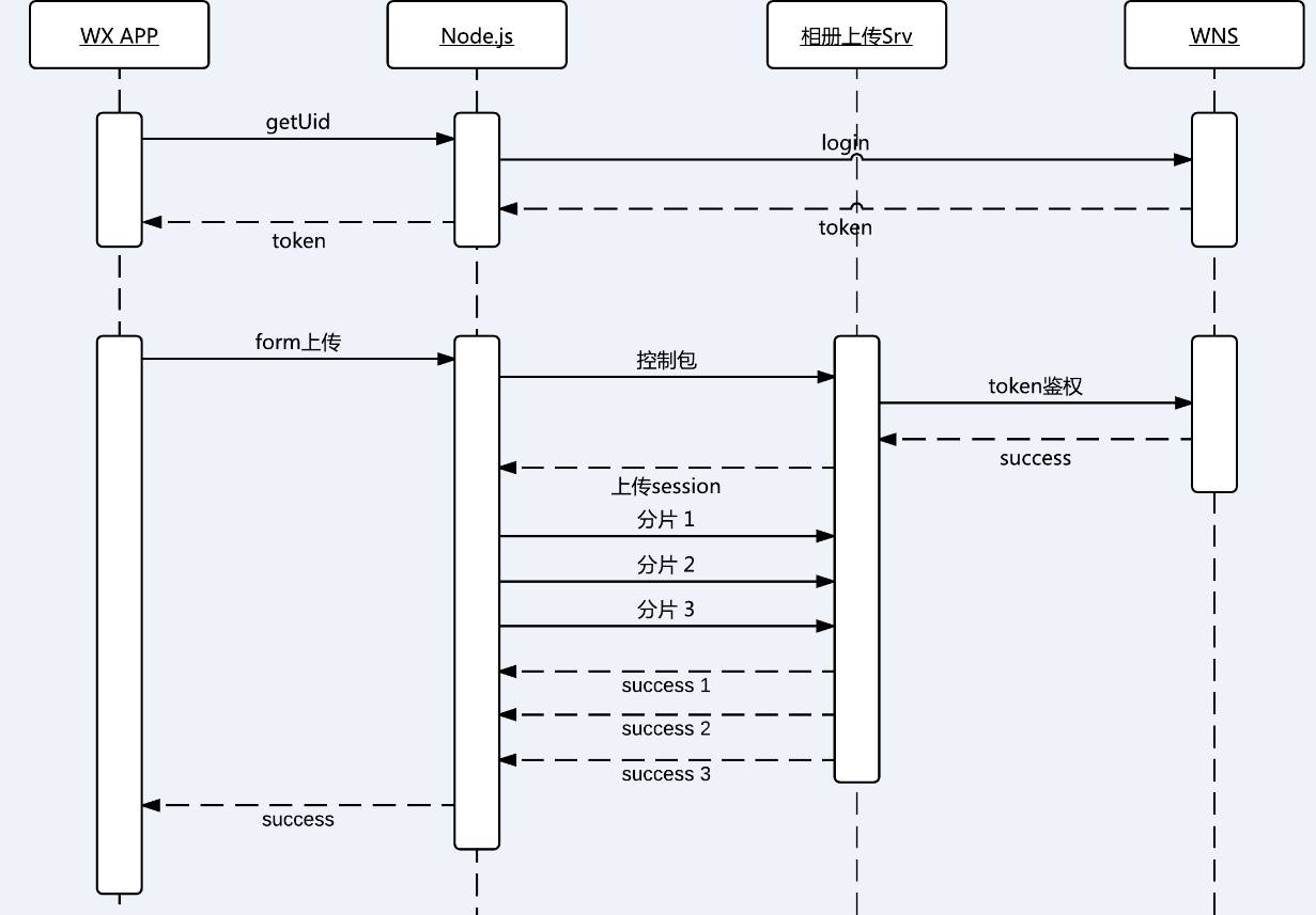 而后者则是尽量同步,接收到图片 / 视频 part 我们就可以开始上传,只是没有刚好满足我们需求的组件来支持。基于以上对比我们选择后面的方案,自己来解析 Form 上传表单,整个上传流程可以看下面的时序图。