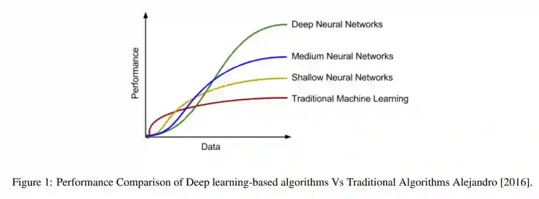 在分析真实世界的数据集时,一个常见的需求是确定哪些实例与所有其他实例不同。这些实例被称为异常,异常检测(也称为异常点检测)的目标是以数据驱动的方式确定所有此类实例(Chandola et al. [2007])。异常可由数据中的错误引起,但有时表示一种新的、以前未知的潜在过程;事实上,Hawkins[1980]将异常点定义为一种与其他观测结果显著偏离的观测。在广泛的机器学习领域,近几年来,深度神经网络在各个应用领域都出现了前所未有的成果。深度学习是机器学习的子集,它通过学习将数据表示为神经网络层内概念的嵌套层次,从而获得良好的性能和灵活性。随着数据规模的增加,深度学习优于传统的机器学习,如图1所示。