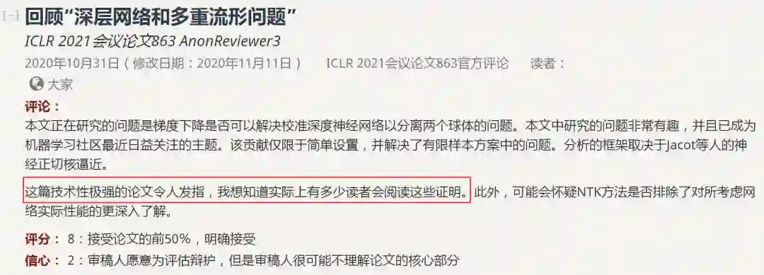 再看一下另外一个给到8分的评审,这条评审首先对论文研究内容给出了肯定,之后又提到这篇论文的技术性之强令人发指,他表示怀疑或许没有多少读者会阅读这些证明。