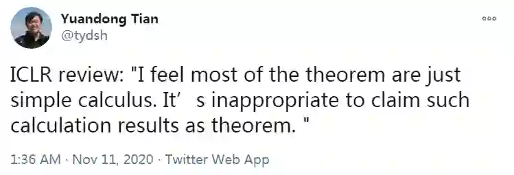 Facebook AI研究员田渊栋指出某个ICLR评论:“我认为大部分定理只是简单的演算,将这样的计算结果称为定理是不合适的。”