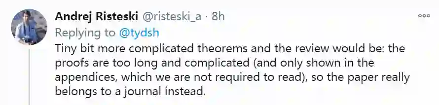 但是稍微有点复杂的定理,评论则将是:证明太长且太复杂(并且仅在附录中显示,我们无需阅读),因此该论文实际上属于期刊。