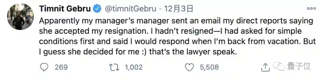 12月3日 ,谷歌AI伦理团队联合负责人Gebru发推文表示:自己被谷歌公司解雇了,而谷歌声称是主动辞职。