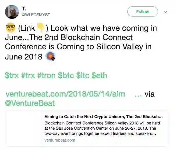 美国主流科技媒体 VentureBeat 的报道是:“意在捕捉到下一个区块链独角兽,Blockchain Connect 大会将于 2018 年六月来到湾区。”