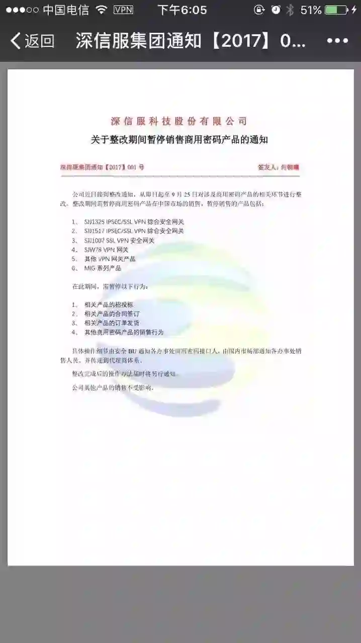 深信服接到整改通知,从即日起至9月25日对涉及商用密码产品的相关环节进行整改,整改期间需暂停商用密码产品在中国市场的销售。
