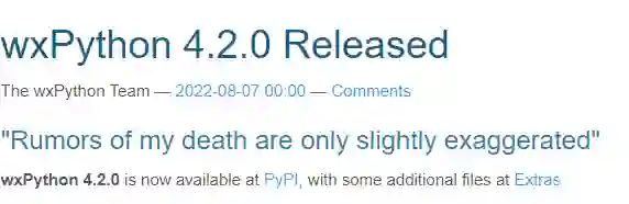 Python跨平台GUI工具wxPython 4.2.0 发布,因距离上次发布版本时间太长,因此有传闻说wxPython已死。官博在官宣新版本的文案中,第一句就是“关于我死亡的传言只是稍微夸大了一点"。