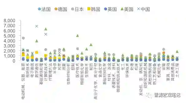 各专利技术,基本是美中日领跑。中国在视听技术、电子通信、数字通信的专利申请数量是世界第一,在电气工程、计算机技术、光学、控制、制药等专利申请量是世界第二,在半导体、测量、医疗技术、精细有机化学、生物技术、材料冶金、涂料、纳米技术、化工、环保技术等专利申请量是世界第三。但在机床、高分子化学、高分子材料、发动机、涡轮机、机械元件等专利申请量在三名开外,这些是中国制造进一步实现技术突破和国产替代的方向。