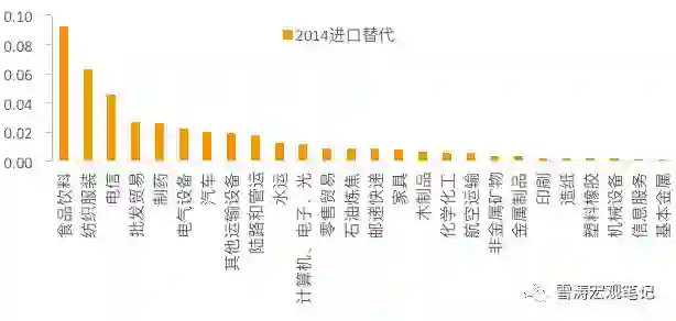 图1:2014年中国各行业进口替代率排名(本国消费驱动的本国总产出比全球总产出) |