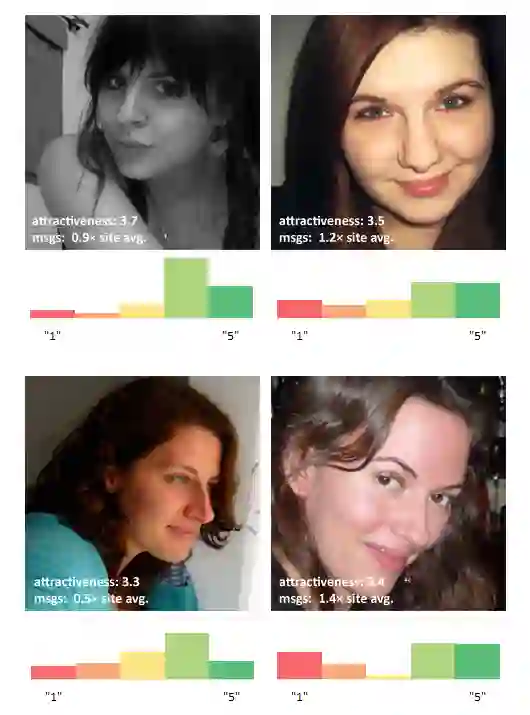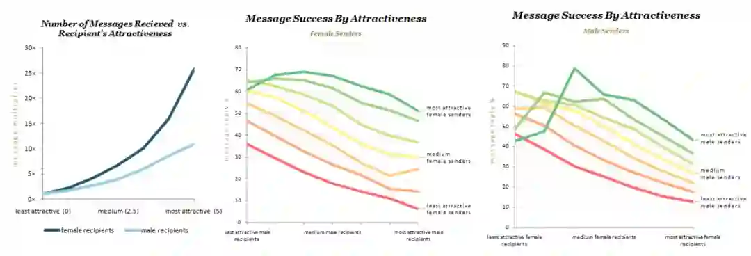 在电商、内容等领域,一个商品、短视频可以海量地分发给各个用户,但是在社交特别是交友领域,这肯定是不行的,道德问题和双向匹配满意度问题都限制了分发的有限性。每个用户作为供给,只能完成一定次数的被匹配 ( 而且这个次数一般不会大 ),同一人能与多人匹配并聊天,但是一般只能与一人成为男女朋友谈恋爱。如果不考虑道德问题,用户的交际带宽也是有限的,无法做到人人有反馈 ( 例如在探探中发现有个女生在几天之内被喜欢了30w次 )。优质用户也只能提供有限的供给,这和书籍或者商品很不一样,并不是只要有库存就可以同时推荐给很多用户。美女帅哥在平台上从来不缺被喜欢,很容易成为产品的头部用户,他们也可以为产品吸引更多的用户进来;如果我们过度推荐这些用户可能会让这些用户收到到上万个喜欢的轰炸,但他们无法提供高的反馈率,比如下图中的头部用户拿到了几倍于普通用户的喜欢,但是回复率和匹配率却是颜值一般的人的五分之一水平 ( 来自于OkCupid Blog )。