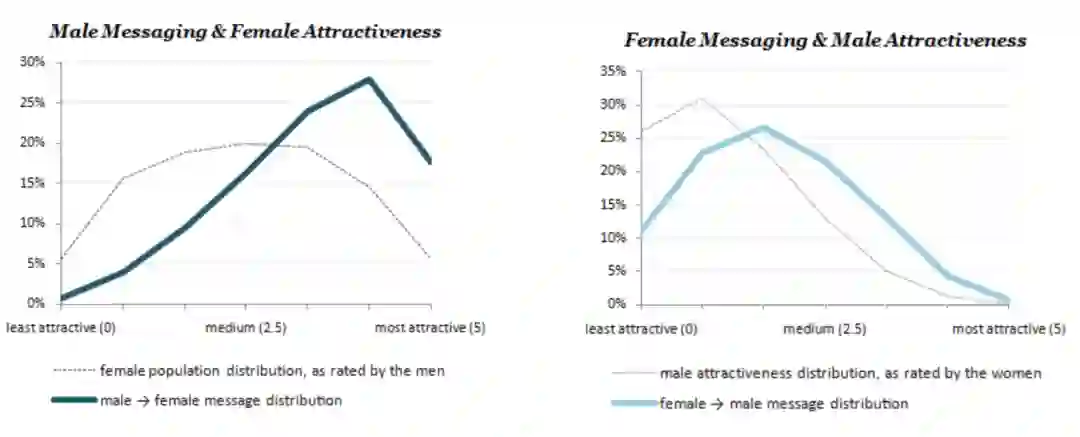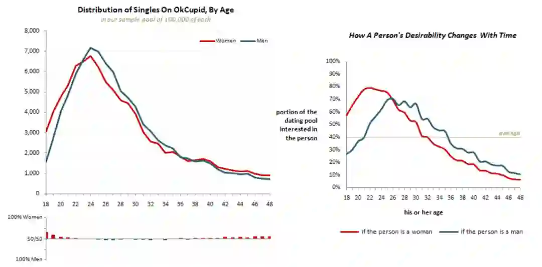 在OkCupid的数据来看 ( 下左图 ),陌生人社交的人群集中在24岁附近,30岁后急剧下降,最后逐渐减少,因为其余的单身人士要么找到伴侣,要么退出了竞争。当然这中间男女吸引力的下降也有区别,比如女性吸引力的峰值出现在31岁,男性则出现在36岁。
