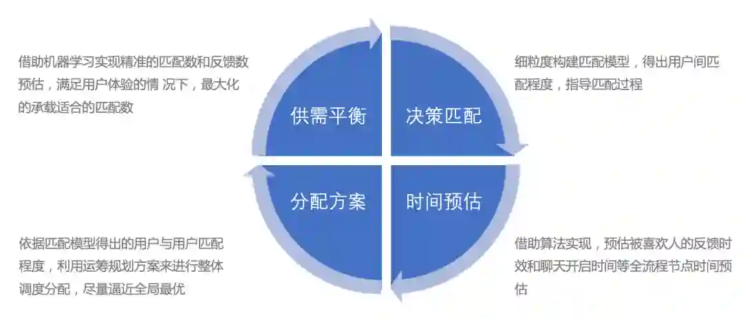 使用智能系统需要做双向概率预估,通过将A对B和B对A的喜欢概率进行预估,并相乘计算匹配成功率;由于反馈及时程度往往也较大地影响了这个用户的留存,所以在给用户匹配其他可能Ta喜欢的人时,我们需要在匹配计算公式中加入对方未来活跃(活跃时间间隔预估)并回复的概率,并作为因子影响匹配成功率。比如对实时在线的用户给予优先权(因子分数高),让反馈速度提升。并且我们在展示层引入供需关系,并通过冷热预估、投放策略(贪心、概率、bandit等)来进行控制。