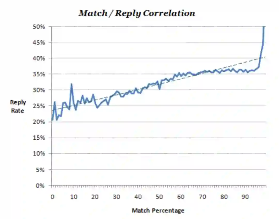 虽然很复杂,很困难,但是在社交领域先行者的探索中,也证明了数据与算法预估建模是可以真实地带来匹配及回复聊天率的上升,通过数据我们可以看到下图的相关性 ( 来自于OkCupid Blog ),在建模匹配率高的真实情况下也是更高的。