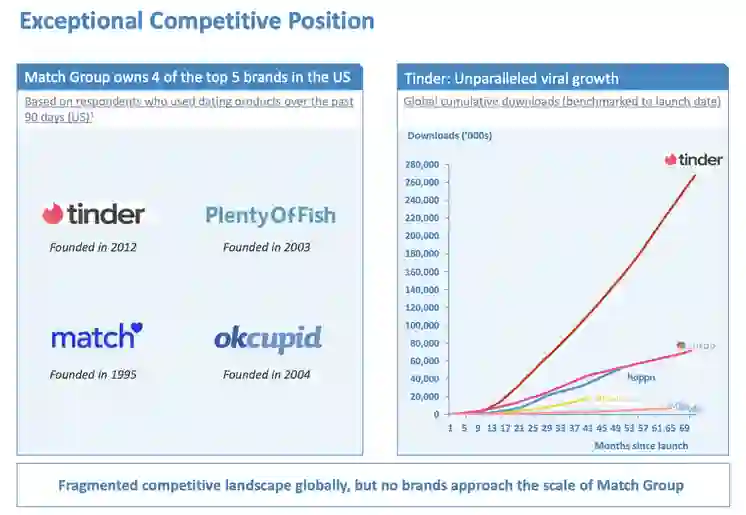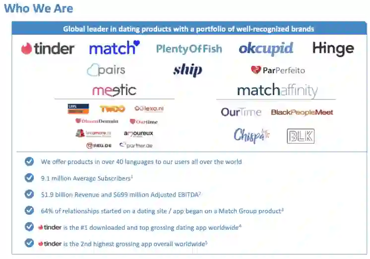 Tinder的母公司Match Group作为交友领域的鼻祖,在婚恋社交领域产品矩阵非常庞大,发展迅速,并且有很好的盈利,旗下产品和近年来的收入及盈利可参考下图 ( 来自其财报 ),其中Tinder更是众多APP中发展最迅猛的,Tinder也是全球除了游戏以外,IAP ( In-App Purchase ) 付费最高的产品。