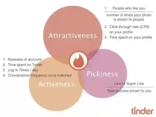 被喜欢率:这个维度的分数取决于有多少人右滑喜欢你,而喜欢你的人自己获得的喜欢越多,对你的分数加成也越大。被喜欢率=被右滑个数/展现次数。