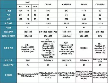 另外5个数据集,CASME、CASME II、CAS(ME)2是中国科学院心理研究所傅小兰团队所建立,SMIC是由芬兰奥鲁大学赵国英团队建立。各个数据集的细节如下表所示: