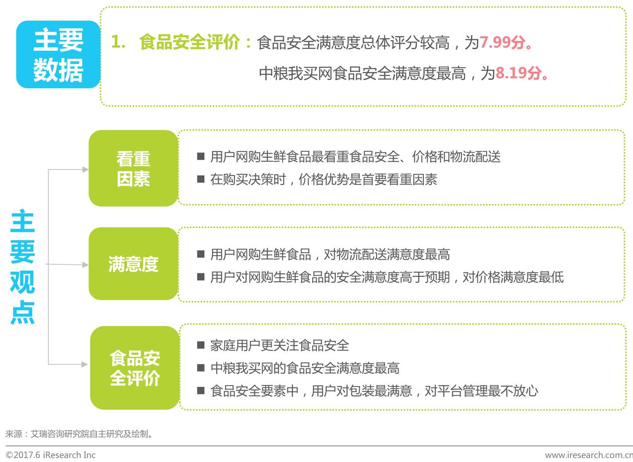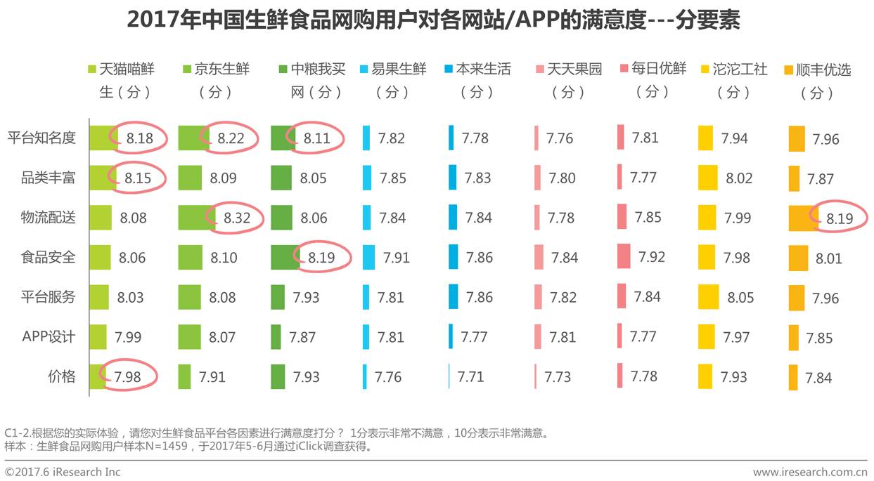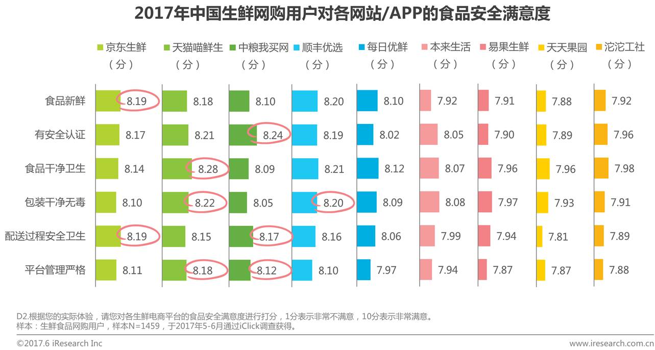 艾瑞调研数据显示,从细分品类和指标来看,生鲜食品平台各有优势。京东生鲜、天猫喵鲜生和中粮我买网的平台知名度较高,评分都在8分以上;从消费者最关注的食品安全要素来看,中粮我买网的满意度最高,为8.19分。