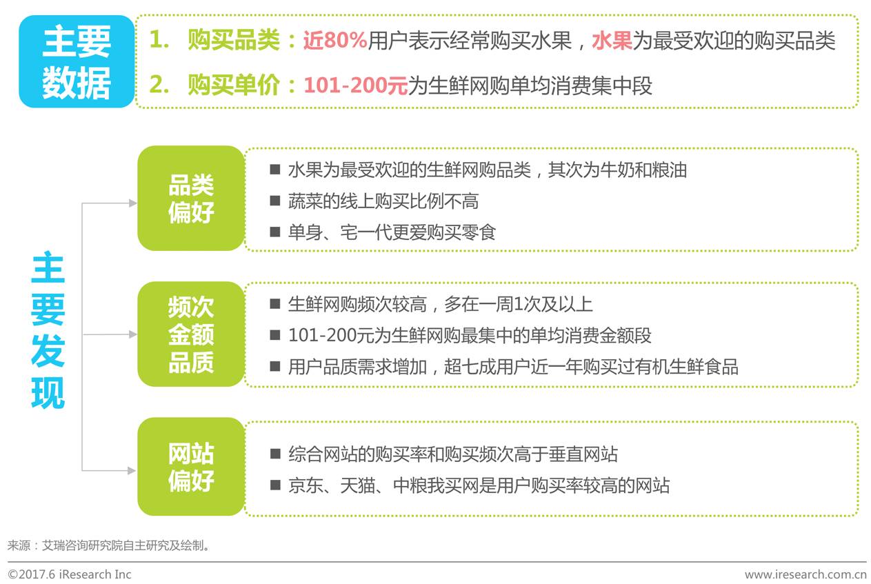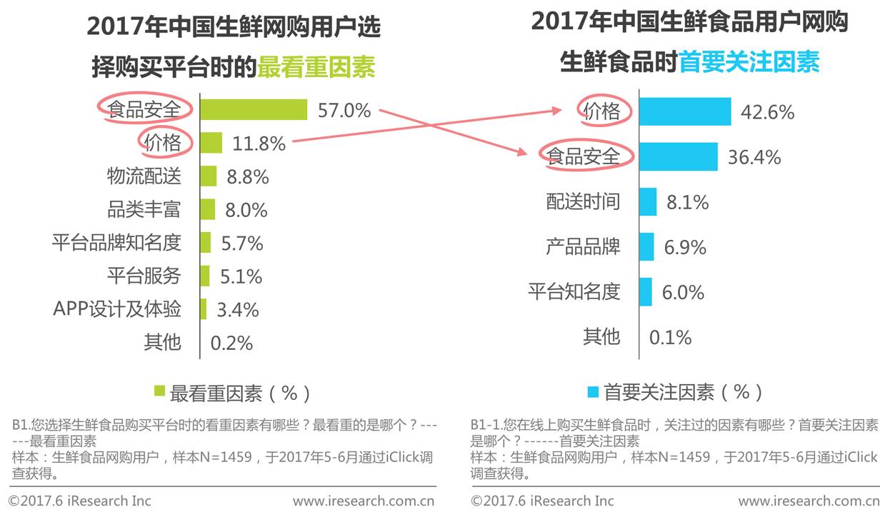 艾瑞调研数据显示,线上食品消费者最看重食品安全,在购买时却更多关注价格。在生鲜网购用户选购商品最看重因素中,食品安全以57.0%的比例位列第一,价格为第二看重因素;而在影响决策的因素中,价格却成为首要的关注要素,关注比例为42.6%,食品安全为第二关注要素,比例为36.4%。用户最看重食品安全,但在决策时受价格等影响更多。艾瑞分析认为,由于生鲜品类众多,且同一品类下的产品由于品牌、产地等不同,差异较大,但用户在购买过程中并不能有效区分不同产品的差异,所以在购买决策时会选择参考更直白的价格因素。