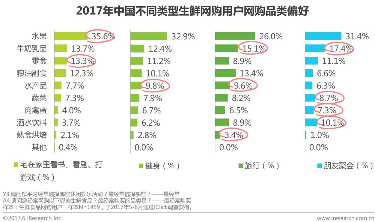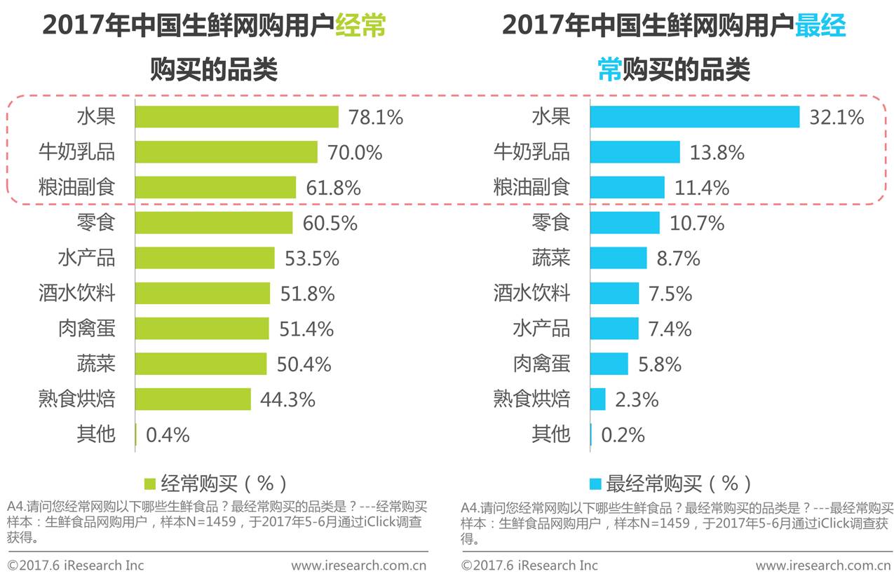 ▌水果、牛奶、粮油为购买率最高的生鲜类型