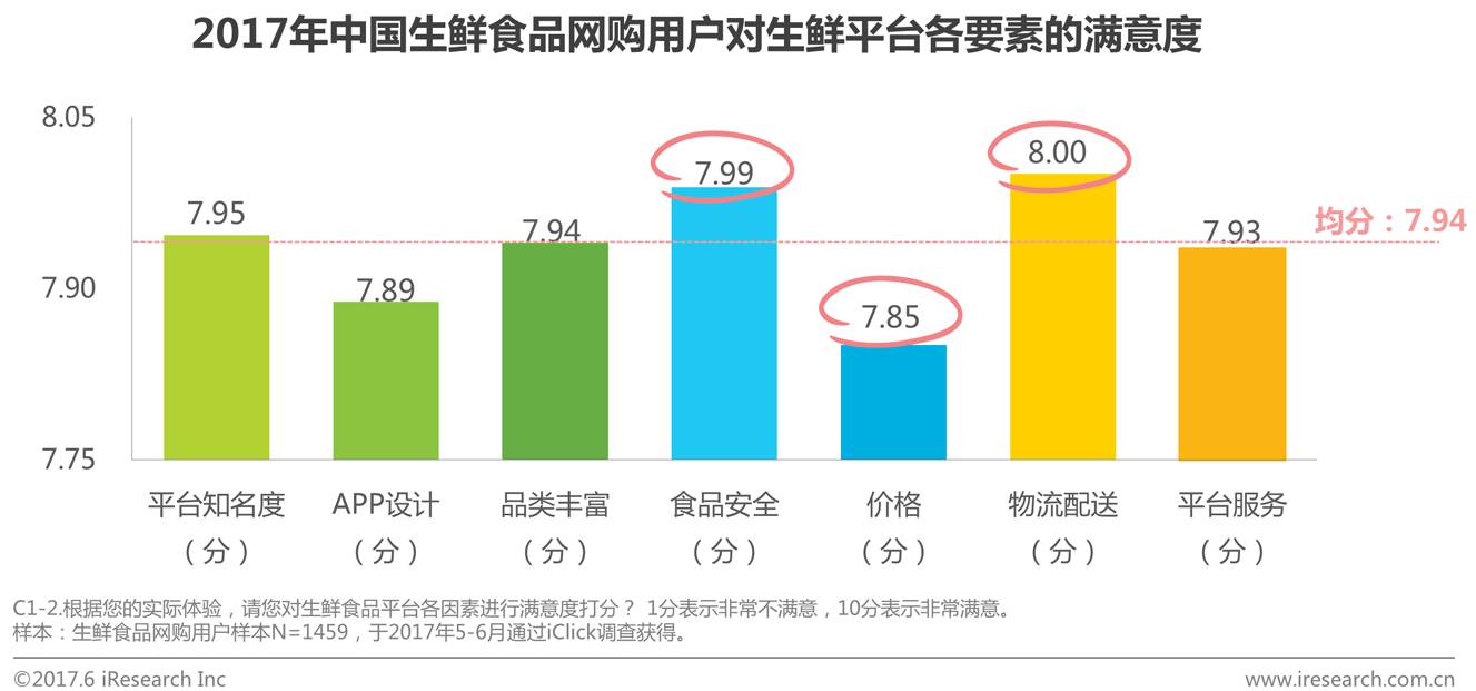 艾瑞调研数据显示,消费者网购生鲜食品最关注食品安全,在满意度评价中对食品安全的满意度相对较高,总体评分7.99仅次于物流的8.00。艾瑞分析认为,生鲜食品具有即时的特点,缩短配送时间,满足消费者的即时需求是各大生鲜平台的基本设计之一,目前很多平台可以实现次日达、当日达、两小时达,甚至30分钟达,物流的及时性以及冷链配送对新鲜度的保证共同推动了用户对物流和食品安全的高满意度。