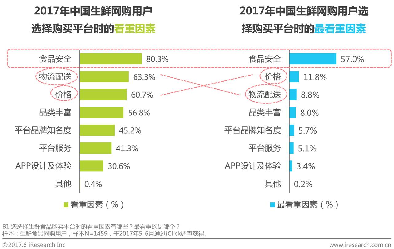 艾瑞调研数据显示,消费者线上购买生鲜时最看重因素为食品安全,在“看重因素”和“最看重因素”中的占比分别为80.3%和57.0%。第二第三看重因素为价格和物流配送,在“看重因素”中,物流配送为第二,选择比例为63.3%,在“最看重因素”中,价格为第二看重点,选择比例为11.8%。