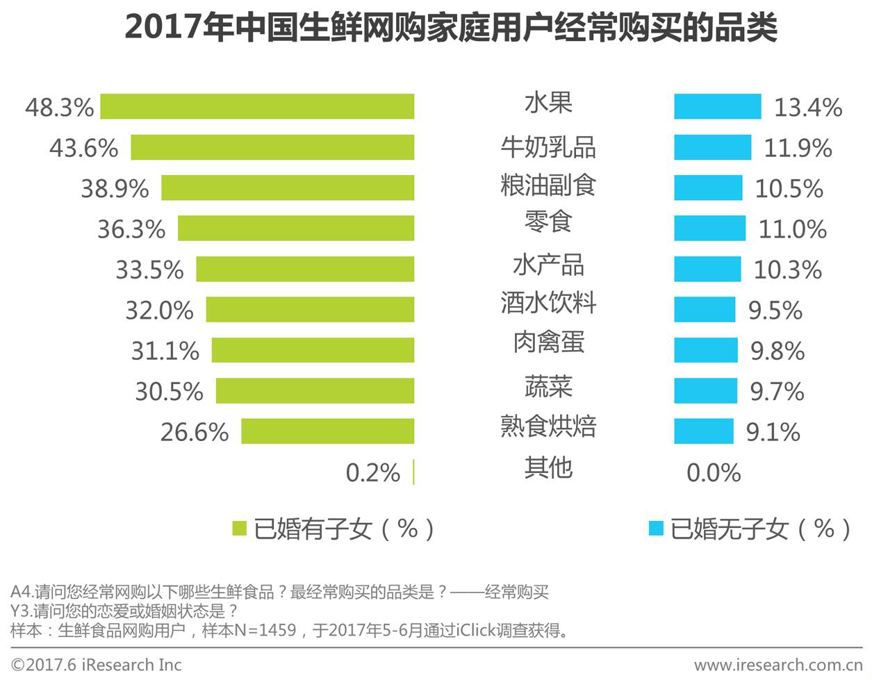 艾瑞调研数据显示,水果和牛奶为家庭用户最常购买品类。整体上看,有子女的家庭在各生鲜品来的购买比例均高于无子女家庭。此外,已婚家庭中,无子女家庭购买零食更多,有子女家庭则更关注自家厨房,更爱购买粮油副食等正餐食材原料。