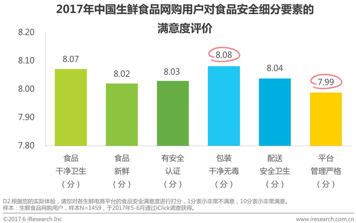 艾瑞将影响网购生鲜食品安全的要素分为以下指标:食品干净卫生、食品新鲜、有绿色安全认证、包装干净无毒、配送安全卫生、平台管理严格。其中,用户对包装满意度最高,评分平均为8.08,对平台的管理最不放心,评分最低,为7.99分。其余评分从高到低依次为食品干净卫生,8.07分;配送安全卫生,8.04分;有绿色安全认证,8.03分;食品新鲜,8.02分。
