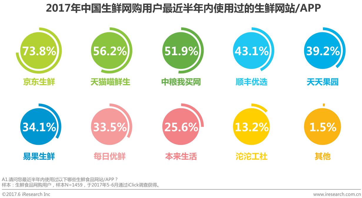 艾瑞调研数据显示,用户最近半年内使用过的生鲜电商网站中综合网站使用率高于垂直网站。其中,京东生鲜使用率最高,为73.8%,天猫喵鲜生56.2%,中粮我买网在垂直网站中的使用率最高,为51.9%。