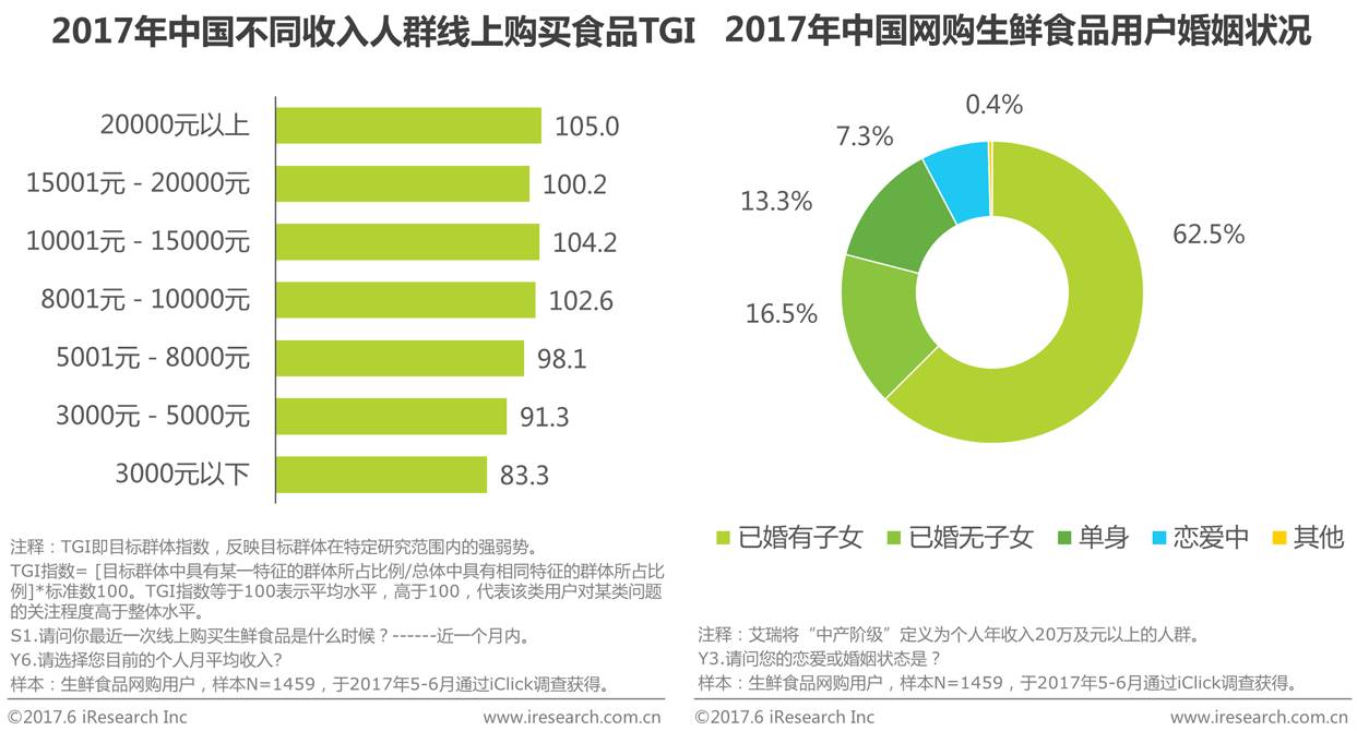 调研数据显示,个人月收入在8000元以上的人群线上购买生鲜食品的TGI较高,为生鲜网购的主要人群来源。同时,在婚姻状况划分中,62.5%来自于已婚有子女人群,16.5%来自于已婚无子女人群,由此可见,中产阶级家庭用户已经成为线上生鲜食品消费的主力。