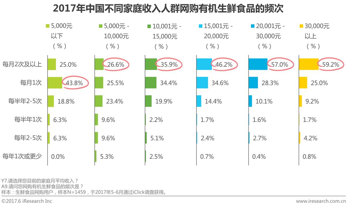♢ 家庭收入越高,消费者对食品重视程度越高,购买有机生鲜产品的频次也更高;